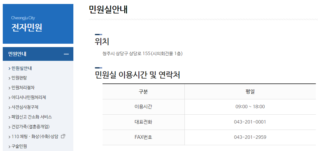 청주시청 홈페이지를 찾는 가장 큰 이유는 아무래도 민원때문이 아닐까 합니다. 청주시청 홈페이지는 민원실안내 메뉴를 두고 있어서 별도로 민원실연락처와 배치도 까지 확인이 가능해요