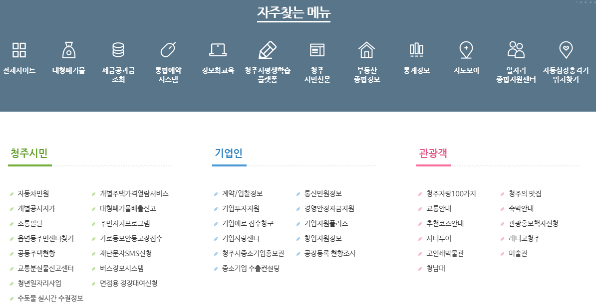 먼저 청주시청 홈페이지를 방문해야겠죠? 홈페이지 접속 방법은 검색엔진에서 청주시청 홈페이지를 검색하시거나 아래의 링크를 통해 간편하게 접속 하실 수가 있습니다.