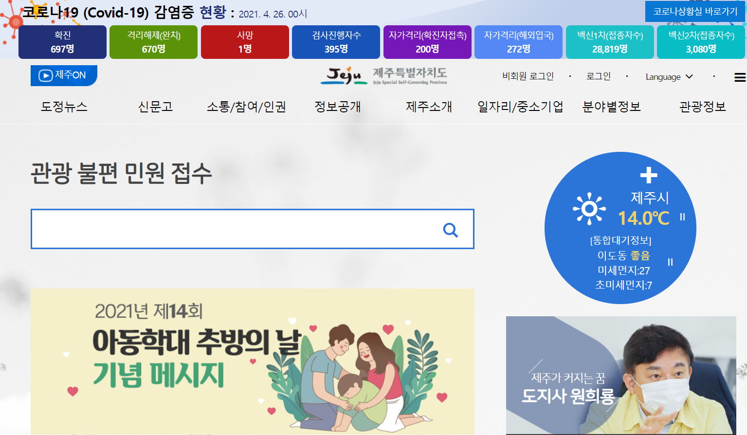 먼저 제주도청 홈페이지의 메인화면입니다. 바로 보이는 메뉴가 바로 관광 불편 민원 접수입니다. 아무래도 제주도의 민원은 관광 관련 민원이 많을 수 밖에 없다고 합니다.