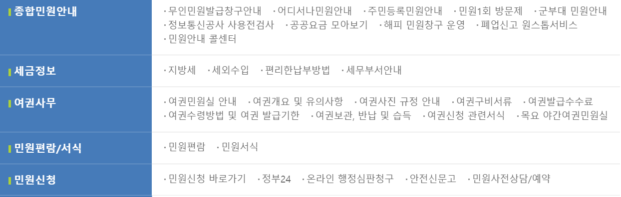 상단메뉴 중에서도 민원안내 메뉴의 세부메뉴를 살펴봅니다. 종합민원안내, 세금정보, 여권사무, 민원신청 등 각종 민원에 대한 안내를 확인하실 수 있습니다.