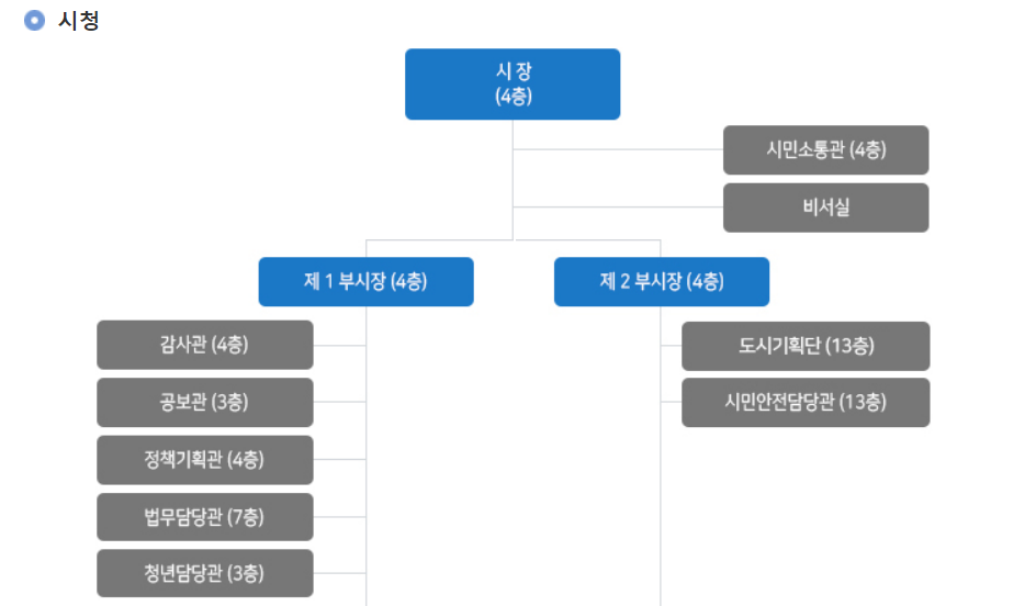 시청에 대한 업무를 보기 위해서는 시청의 조직도를 가장 먼저 살펴보아야 합니다. 그래야만 원하는 부서로 민원문의가 가능하며, 보다 빠르게 민원처리를 할 수 있습니다.