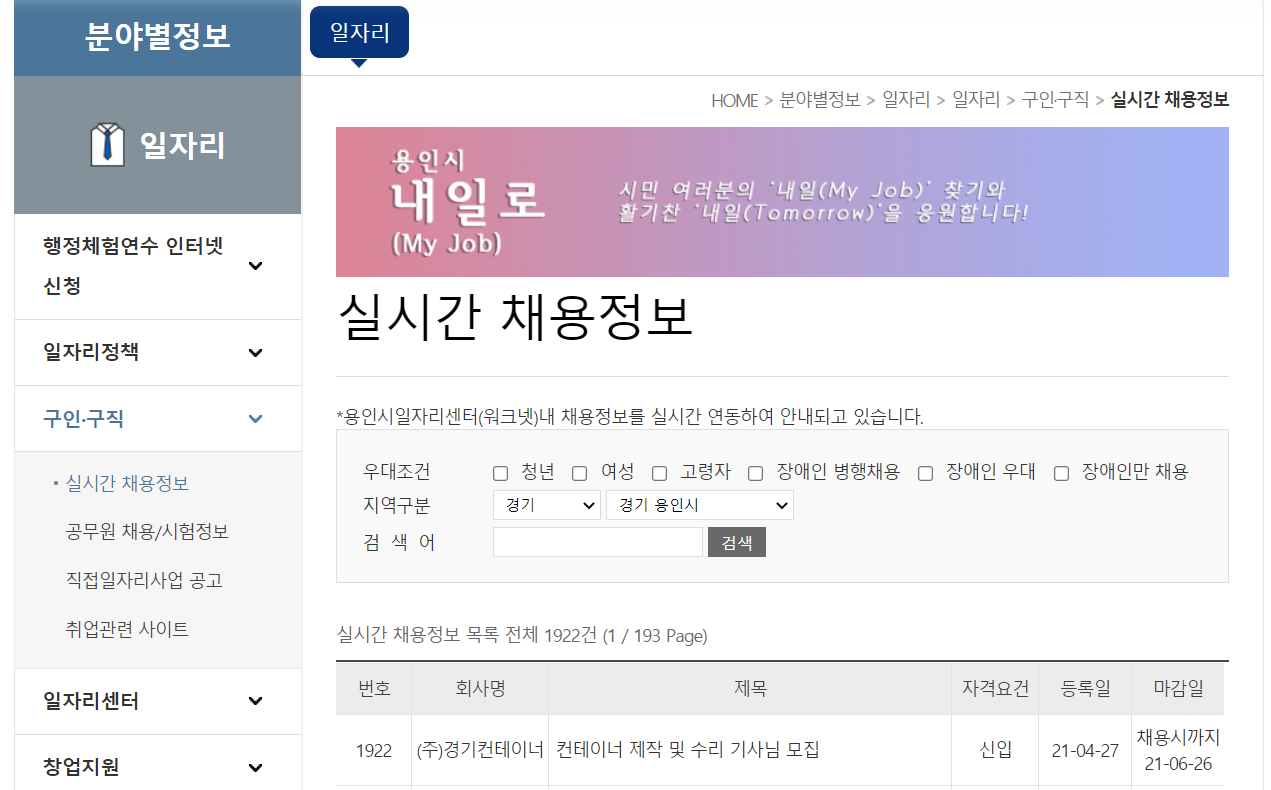 그리고 용인시청 홈페이제에서도 중요한 필수 정보중에 하나가 바로 용인시 내일로 일자리 채용정보입니다. 용인시 관내의 다양한 일자리 정보를 소개해 주고 있습니다.