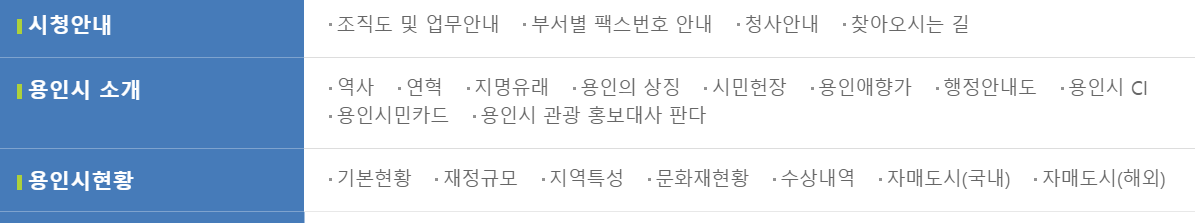 두번째 메뉴 소개는 용인소개 메뉴 입니다. 여기서는 시청안내, 용인시 소개, 용인시 현황에 대해 살펴볼 수 있는데요. 시청의 조직도와 청사안내, 오시는 길의 확인이 가능합니다.