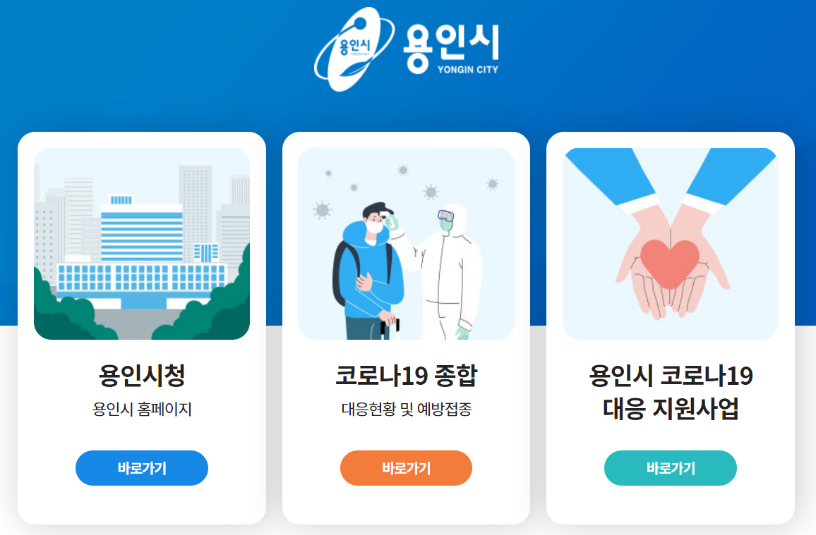 용인시청 홈페이지로 접속을 하시면 아래와 같이 3개의 홈페이지가 안내되어 나옵니다. 가장 좌측이 대표홈페이지, 가운데가 코로나 안내, 우측이 코로나 지원사업 안내입니다.