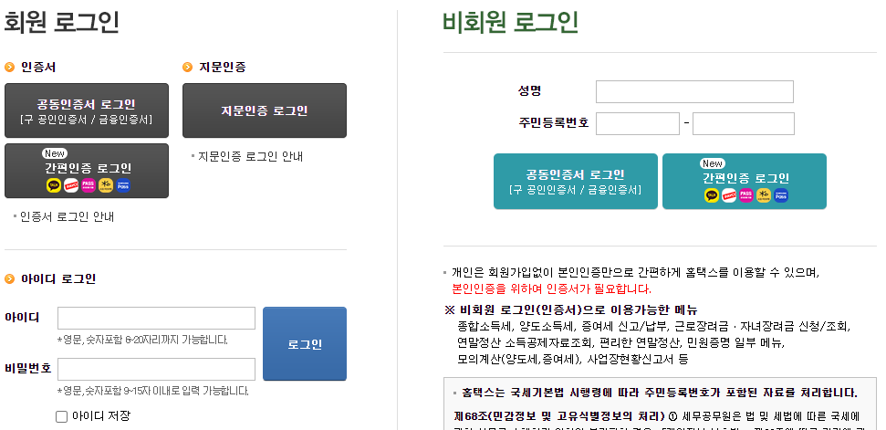 해당 메뉴를 선택하시고 이용을 하시려면 로그인을 해야 합니다. 아래와 같이 공동인증서, 지문인증, 간편인증, 아이디, 비회원의 로그인 방법으로 로그인 하실 수 있습니다.