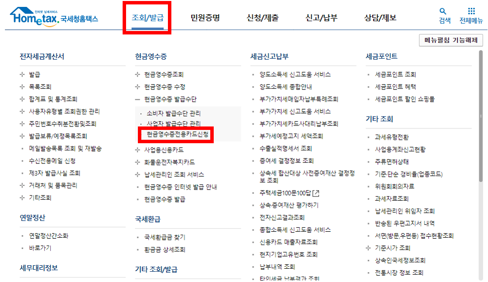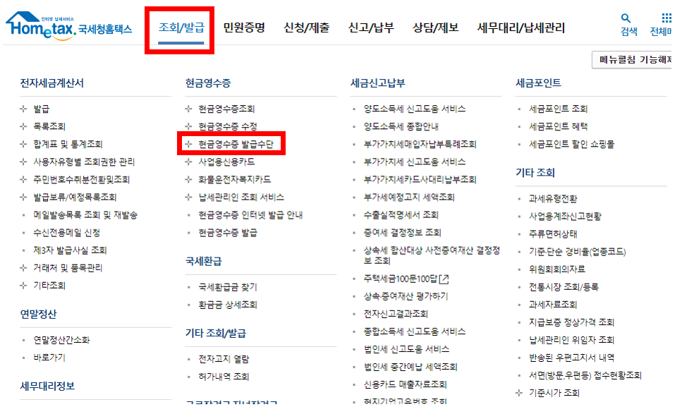③ [홈택스] → [ 조회/발급] → [현금영수증] → [현금영수증 발급] 에서 신청