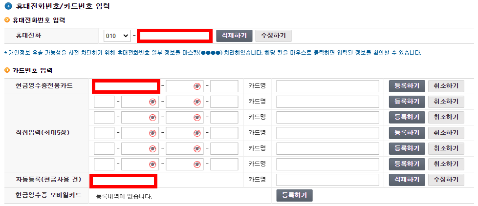현금영수증을 발급받을 때 사용하였거나 사용하실 카드번호, 휴대전화번호를 입력하셔야만 귀하의 영수증 사용내역이 집계되니 필히 입력하여 주시기 바랍니다