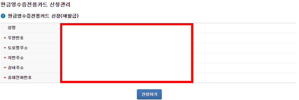 전용카드 신청하기를 누르면 성명, 우편번호, 도로명주소, 지번주소, 상세주소. 휴대전화번호 등을 확인하여 신청이 가능합니다. 현금영수증도 꼭 등록을 하셔서 사용하시면 좋겠습니다.