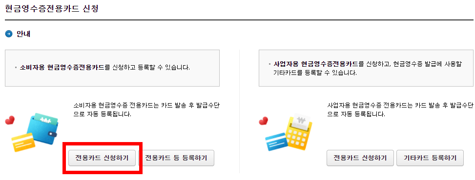 현금영수증전용카드는 소비자용과 사업자용의 두 가지가 있습니다. 사용하시는 목적에 맞게 전용카드 신청하기로 신청을 하시면 됩니다.
