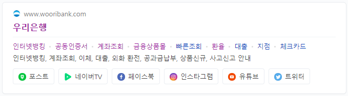 우리은행을 검색하면 아래처럼 대표홈페이지가 바로 검색이 됩니다. 은행에서 제공하는 다양한 서비스를 한번에 살펴 볼 수가 있습니다. 아래의 바로가기로 간편하게 접속하시면 됩니다.