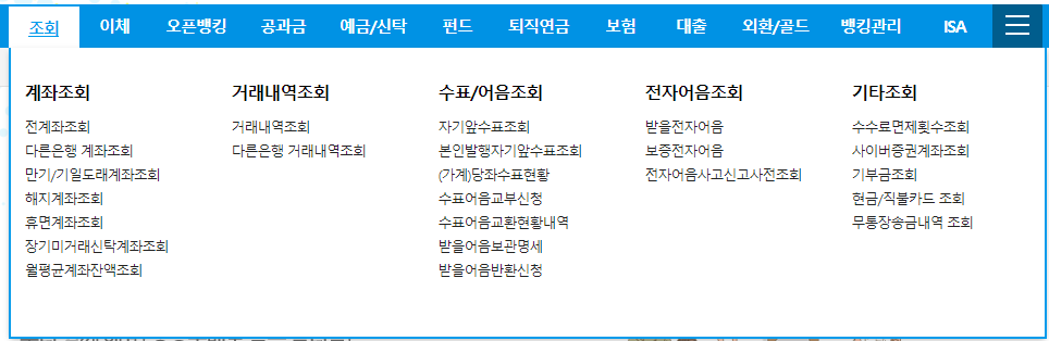 음.. 상단에는 메뉴들이 많이 있는데 그중에서도 조회메뉴를 한번 살펴 볼게요. 조회를 누르시면 아래처럼 계좌조회, 거래내역조회, 수표/어음조회 등의 메뉴가 있습니다. 은행의 메뉴는 상당히 많아서 찾기가 조금 불편?할수도 있습니다.