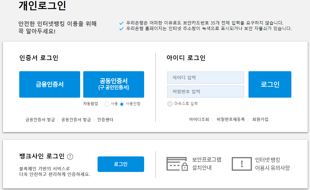 그런데? 우리은행 홈페이지롤 제대로 이용하시려면 로그인을 하셔야 합니다. 대부분 개인이시기 때문에 개인로그인을 선택하시면 아래와 같은 로그인 화면이 나옵니다. 금융인증서, 공동인증서, 아이디 등의 방법으로 로그인 하시면 됩니다.