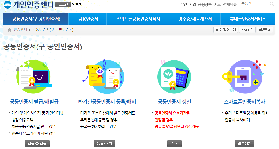 우리은행의 개인인증센터 안내입니다. 인증센터는 은행의 인터넷뱅킹 업무를 하기 위해서는 필수로 사용해야 하는 메뉴입니다. 공동인증서의 발급과 갱신, 스마트폰 인증서 복사 등의 서비스를 사용할 수 있기 때문입니다.