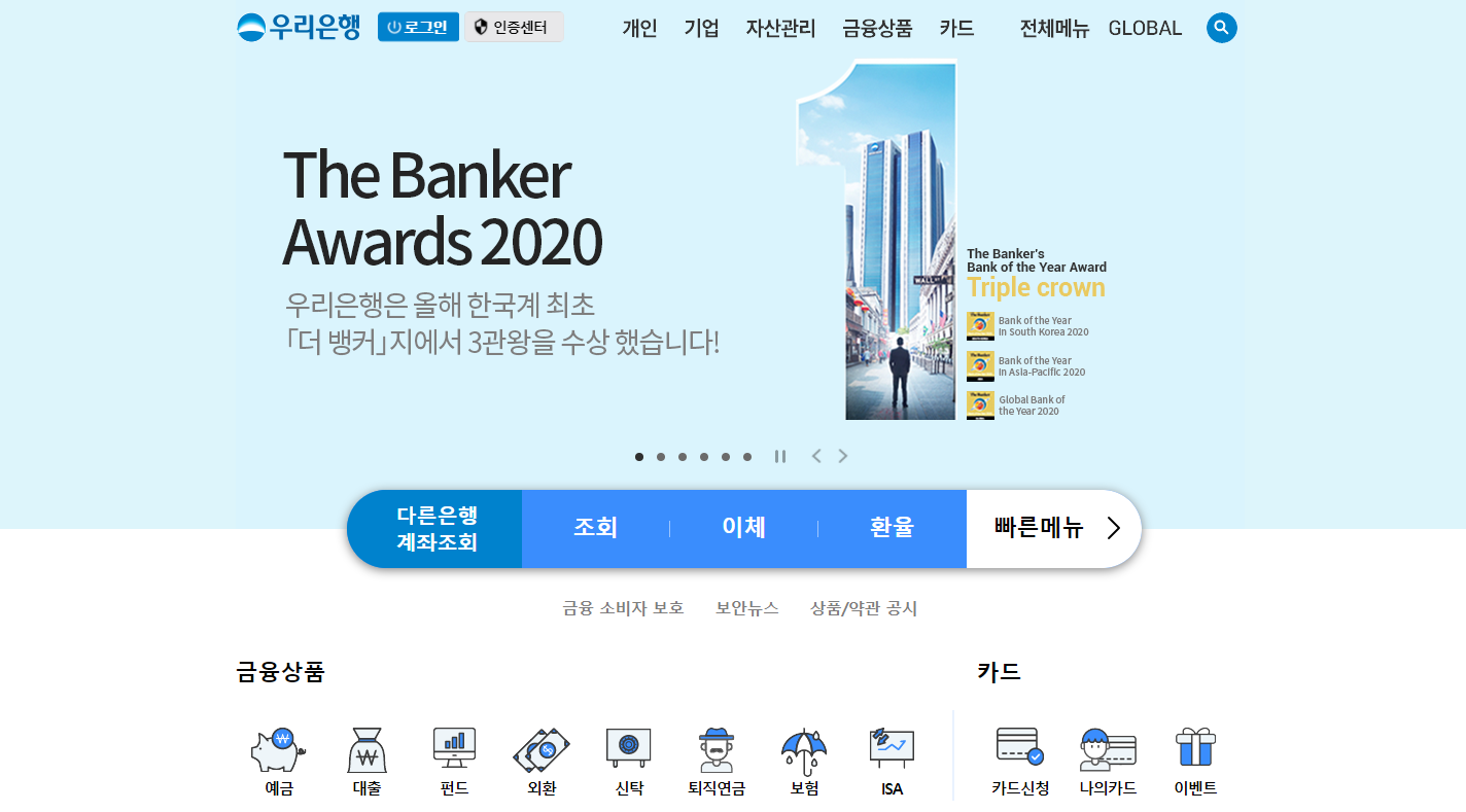 우리나라가 세계에서 손꼽힐 정도로 내세울 만한 것 중에 하나가 바로 금융서비스라고 생각을 합니다. 그만큼 우리는 쉽고 간편하게 은행업무를 볼 수가 있기 때문입니다. 많은 은행이 있지만 우리나라 우리은행이라는 슬로건의 우리은행에 대해 살펴겠습니다.