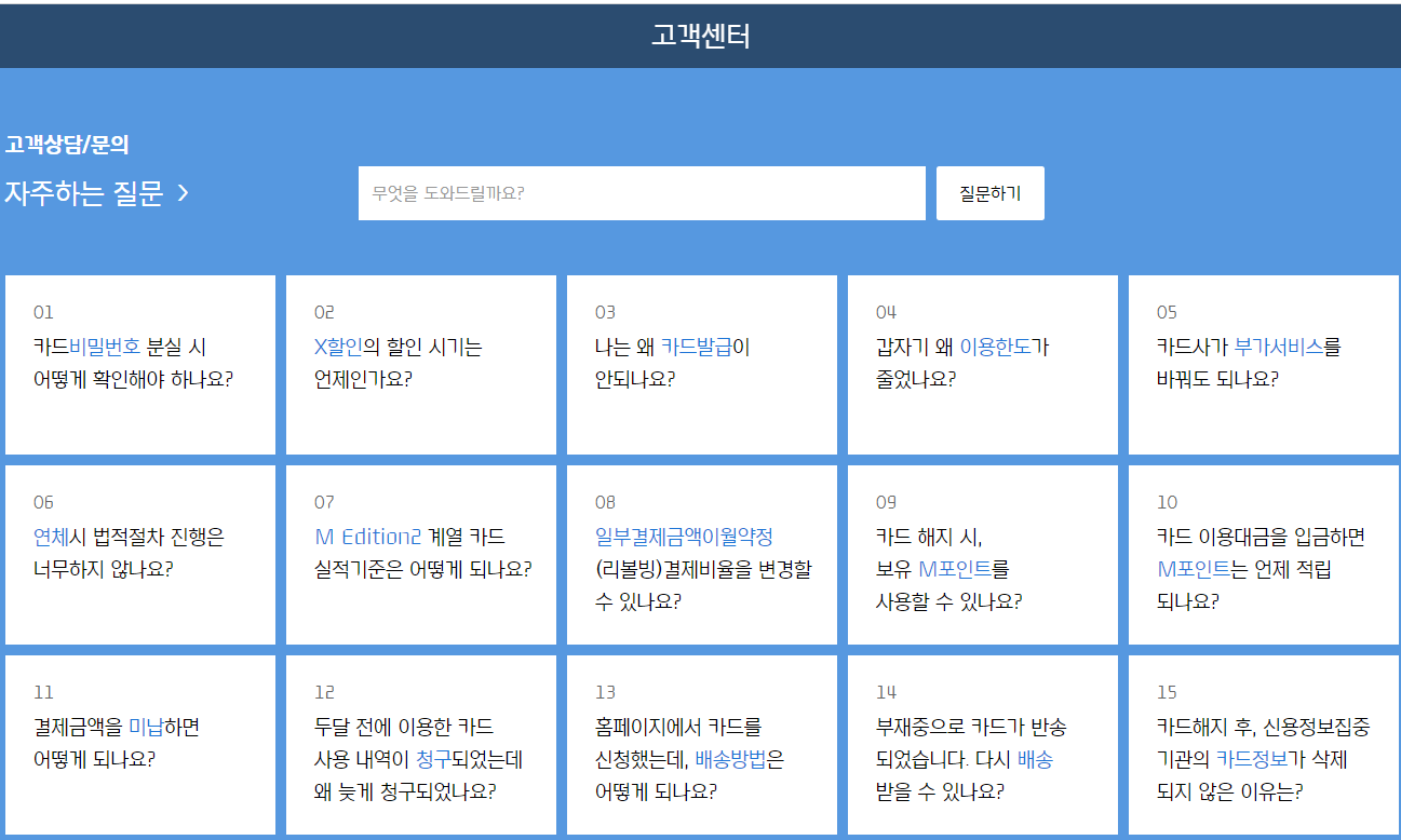 지금까지는 현대카드에 대한 주요 정보들을 소개했다면 이것 만큼이나 중요한 서비스를 안내해 드립니다. 바로 고객센터인데요. 의외로 고객센터를 이용하는 경우가 많습니다. 고객센터의 주요 메뉴는 아래와 같습니다.